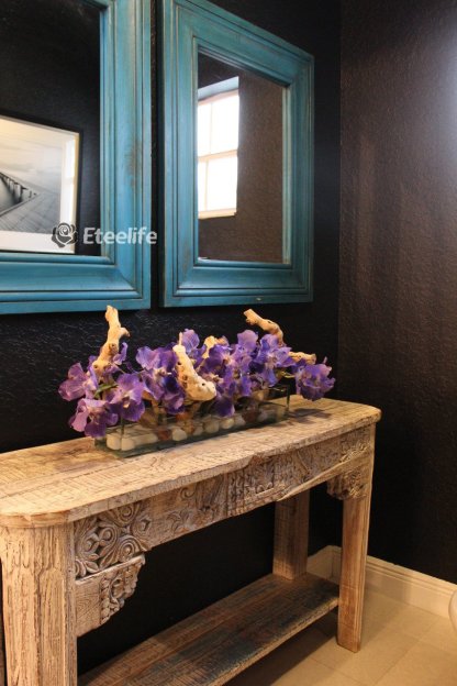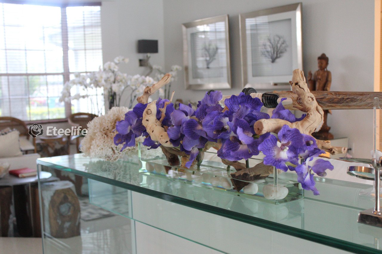 24″ Casa Moderna Glass Plate planter purple vanda orchids, sandblasted grape wood, white stones and our illusion water.