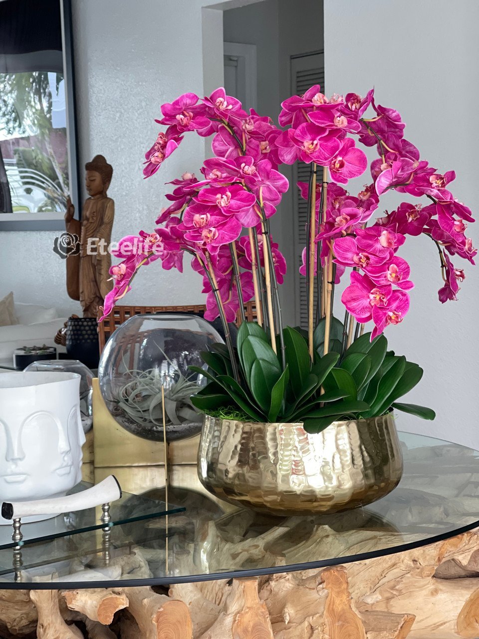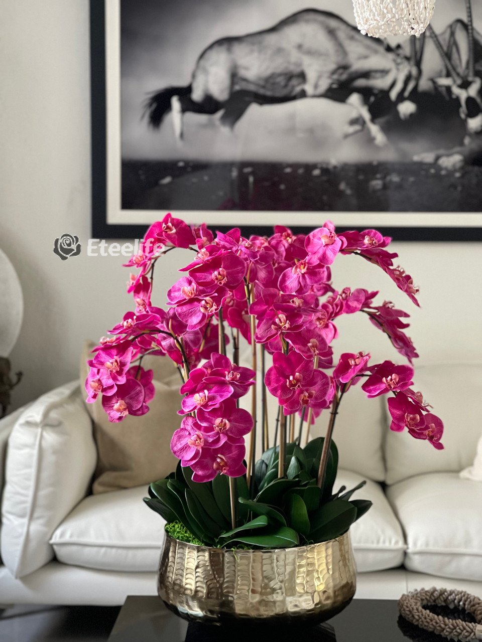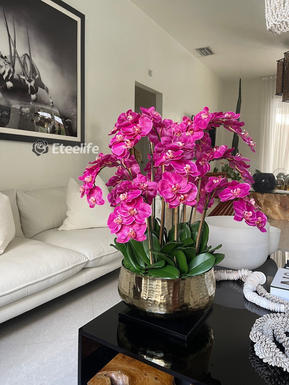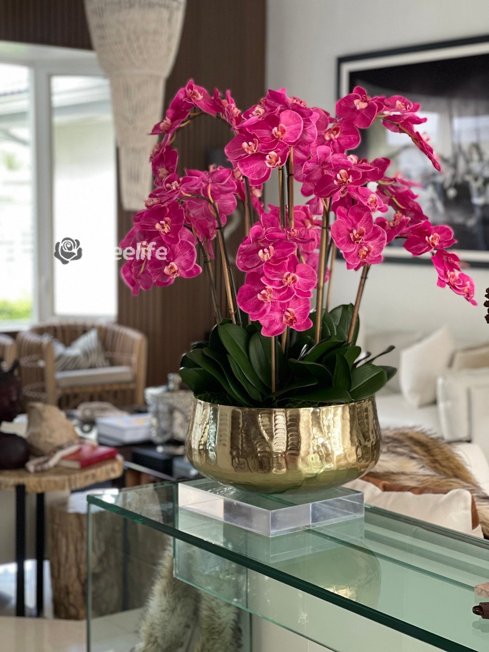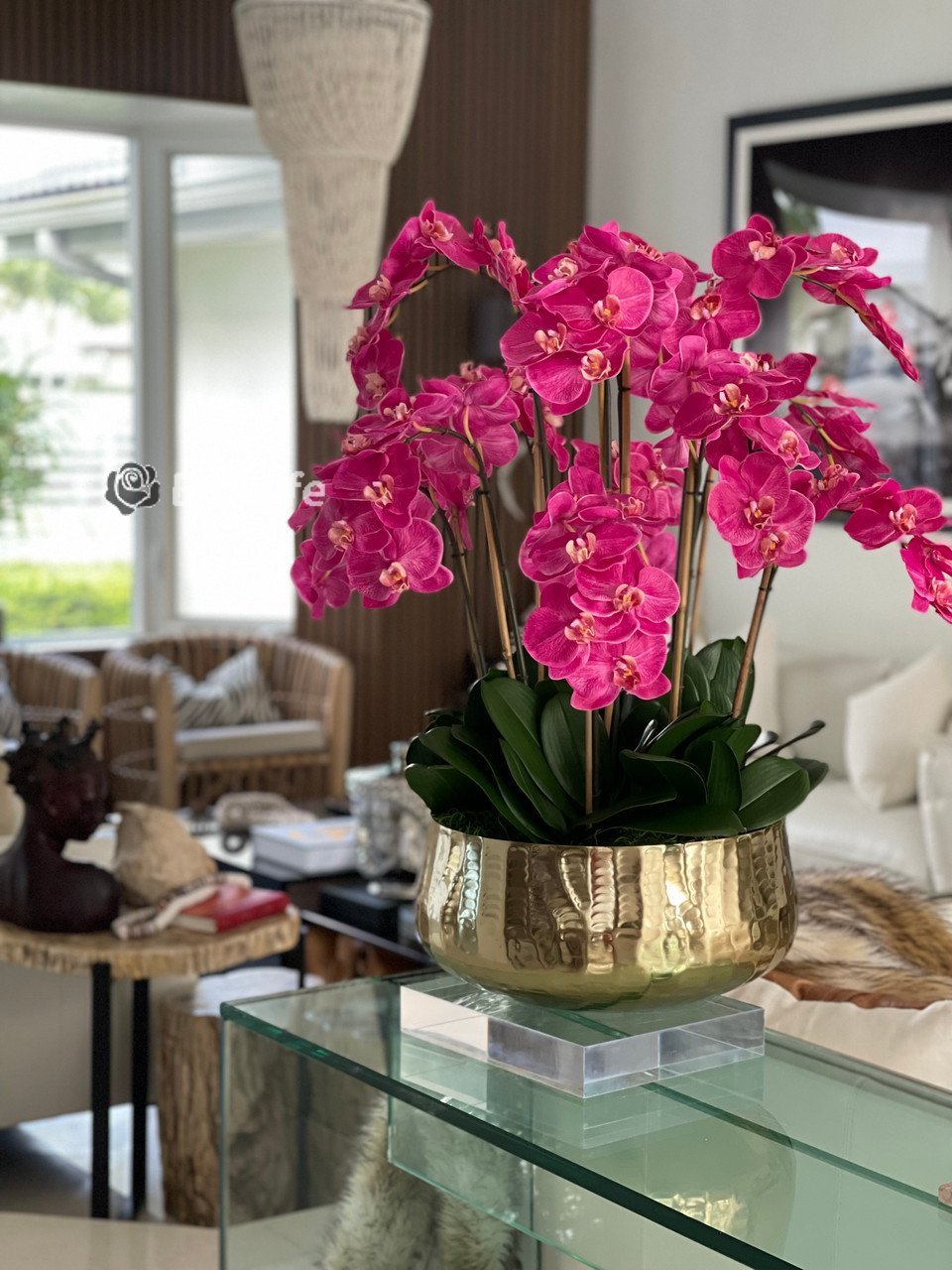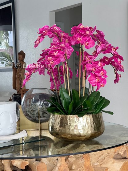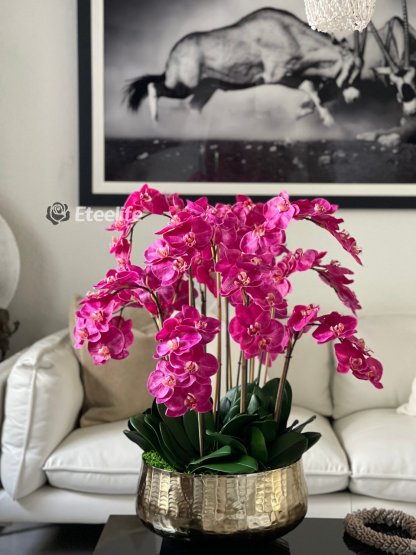 Graceful and exotic, the orchid has symbolized integrity, nobility, and luxury for centuries. Our enduring, bright pink phalaenopsis arrangement captures the artistry and spirit of natural orchids. It’s prized for its profusion of perfect blooms. Vertical bamboo stakes, broad green leaves, and a genuine moss base add to the realism of this arrangement. Often called the “moth orchid,” the phalaenopsis is a favorite among our designers for its dense leaves, elegantly arching sprays and lovely blooms. Our remarkably lifelike arrangement is staked into a moss-covered base in an elegant gold planter for a timeless, authentic look that will endure for years to come. This arrangement is just the right size and is versatile enough to use as a coffee table centerpiece, a dining room or console table. It has a luscious tropical feel that will add vibrancy, color and elegance to any room.