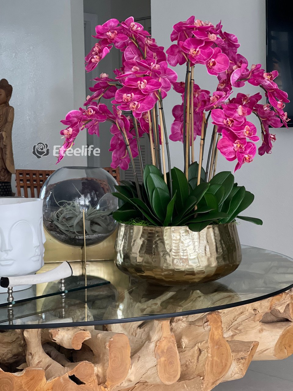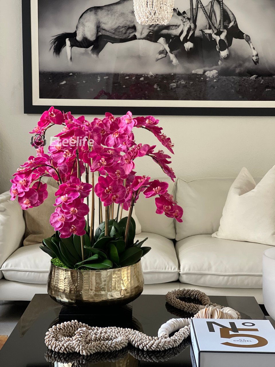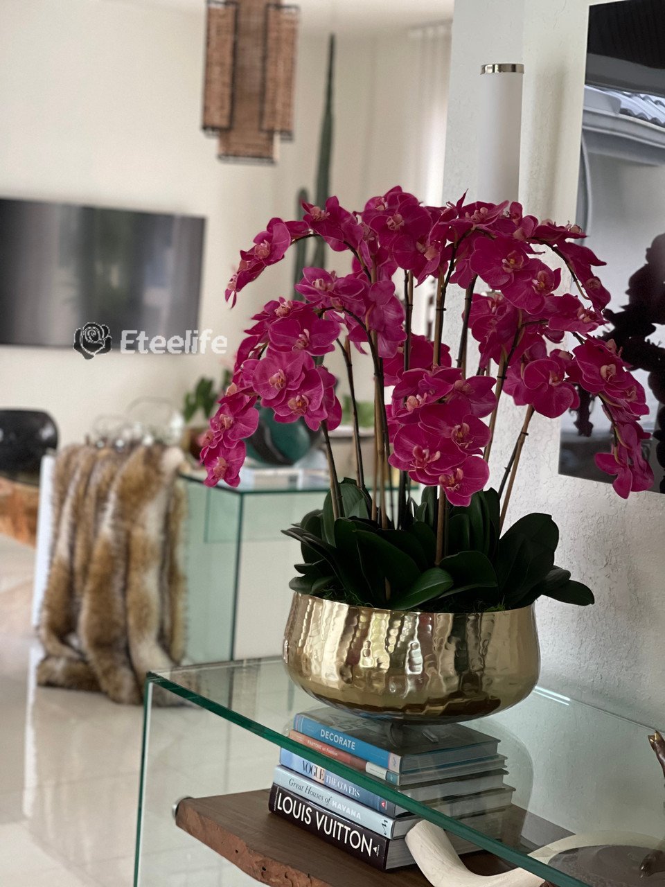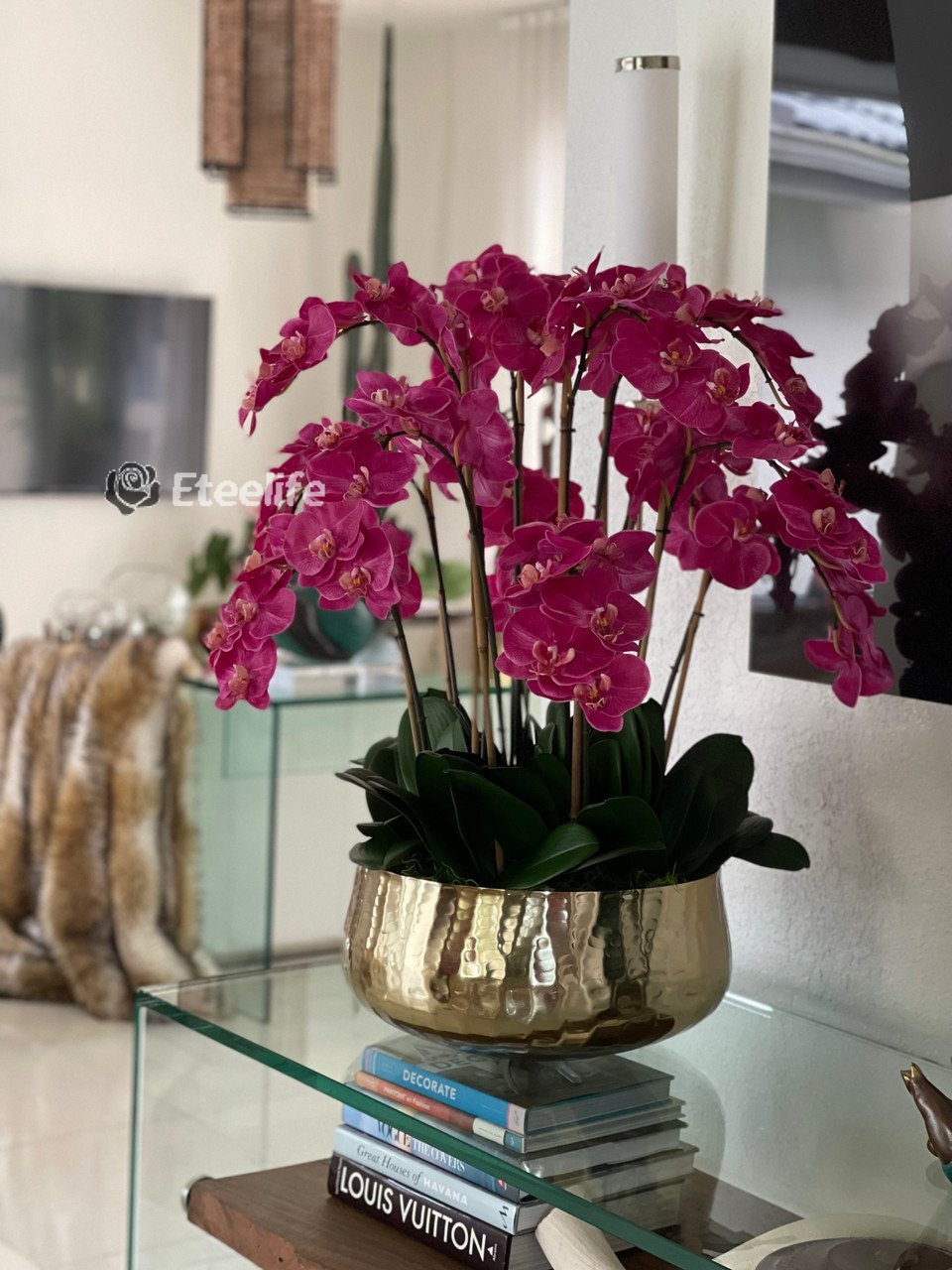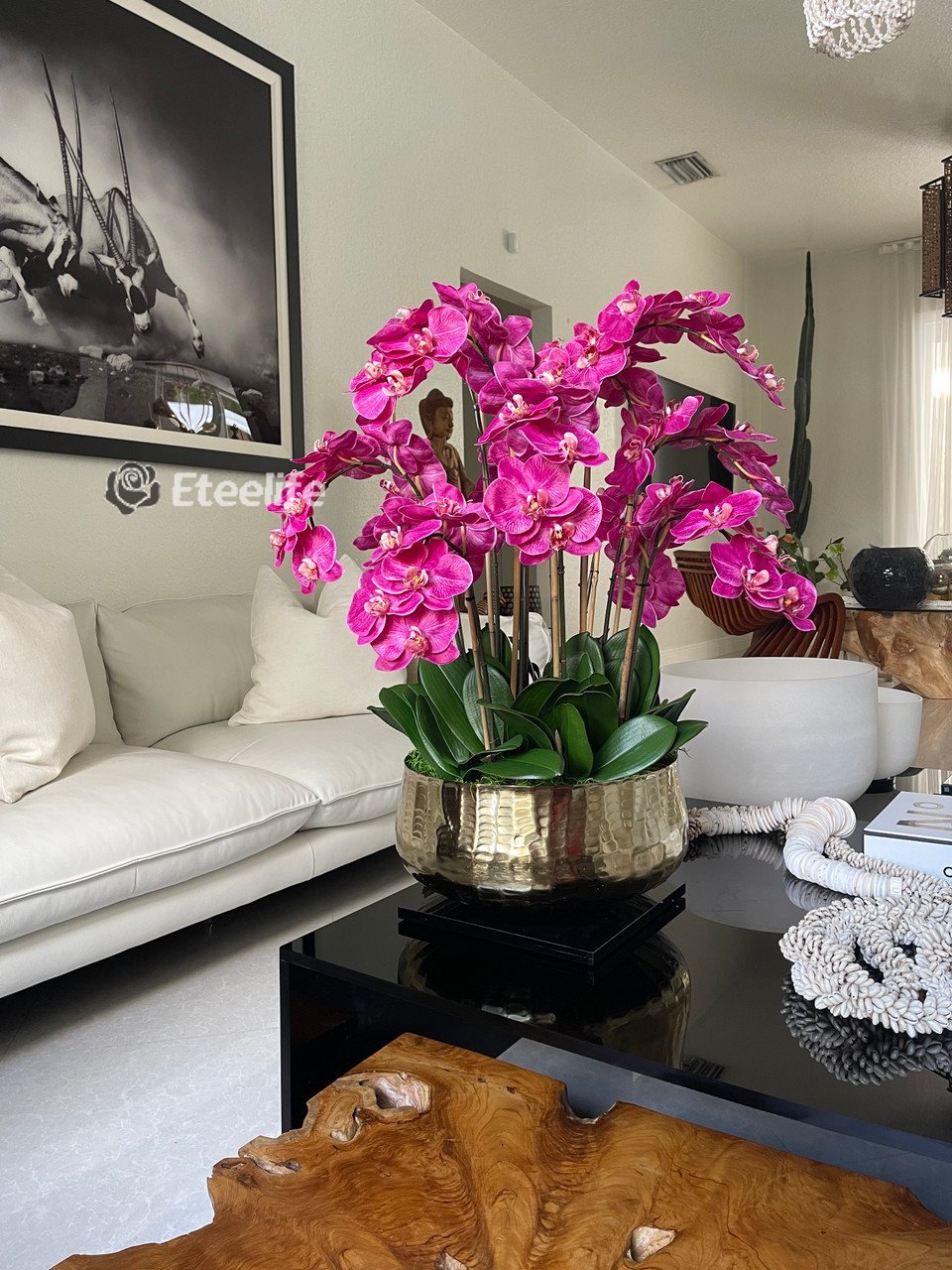 Graceful and exotic, the orchid has symbolized integrity, nobility, and luxury for centuries. Our enduring, bright pink phalaenopsis arrangement captures the artistry and spirit of natural orchids. It’s prized for its profusion of perfect blooms. Vertical bamboo stakes, broad green leaves, and a genuine moss base add to the realism of this arrangement. Often called the “moth orchid,” the phalaenopsis is a favorite among our designers for its dense leaves, elegantly arching sprays and lovely blooms. Our remarkably lifelike arrangement is staked into a moss-covered base in an elegant gold planter for a timeless, authentic look that will endure for years to come. This arrangement is just the right size and is versatile enough to use as a coffee table centerpiece, a dining room or console table. It has a luscious tropical feel that will add vibrancy, color and elegance to any room.