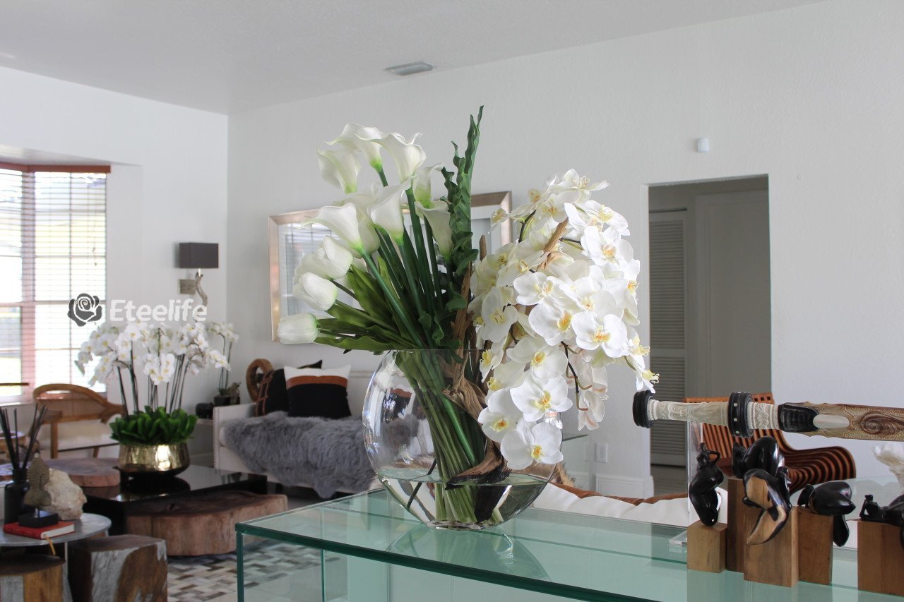 Moon vase 16″ with a mixed bouquet of white calla lilies, white tulips, orchids, philodendron leaf and sandblasted ghost wood anchored in our illusion water.