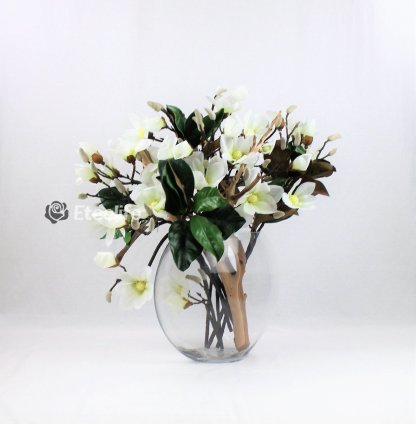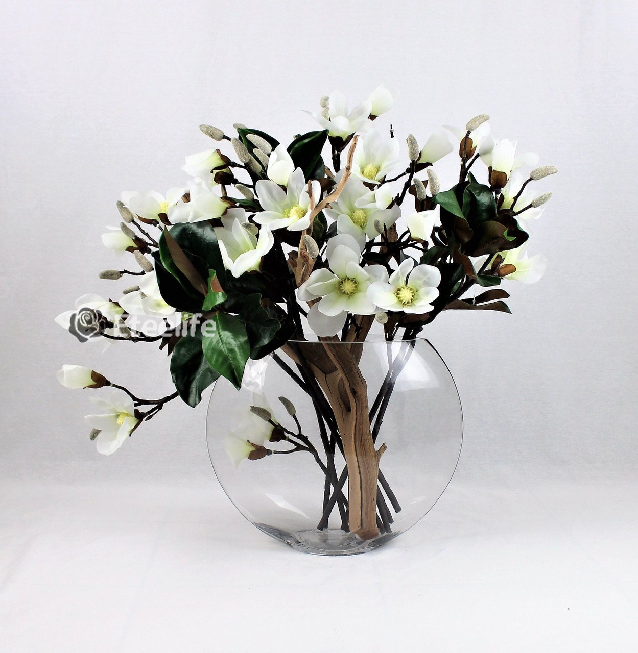 16″ Moon vase with multiple stems of white magnolia blossoms, foliage and sand blasted ghost wood anchored in our illusion water.
