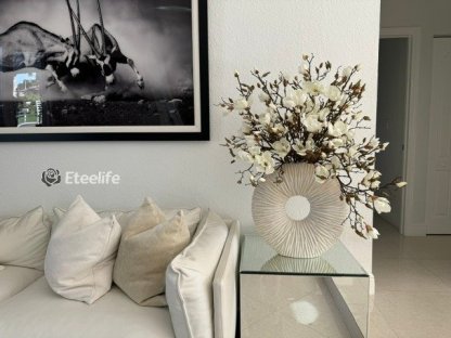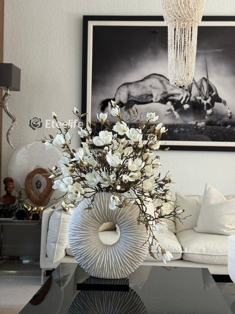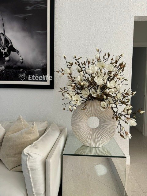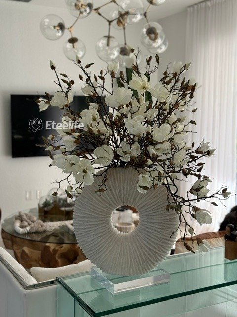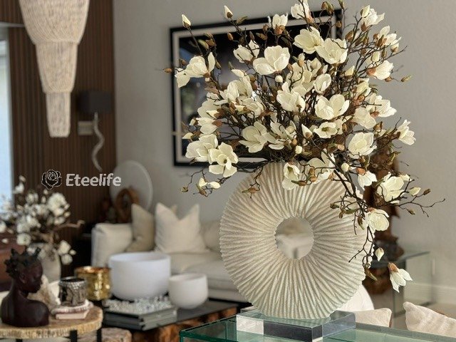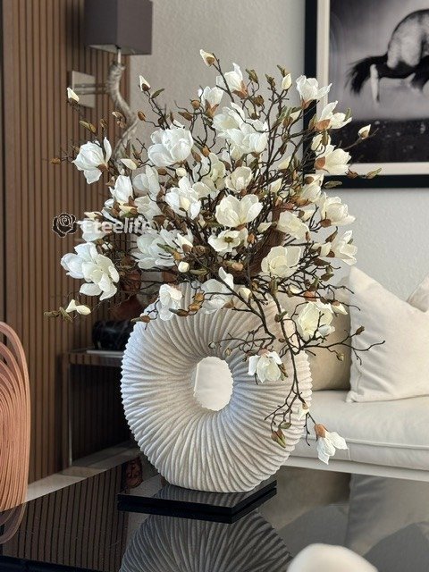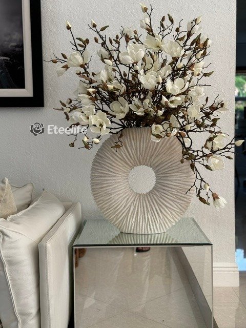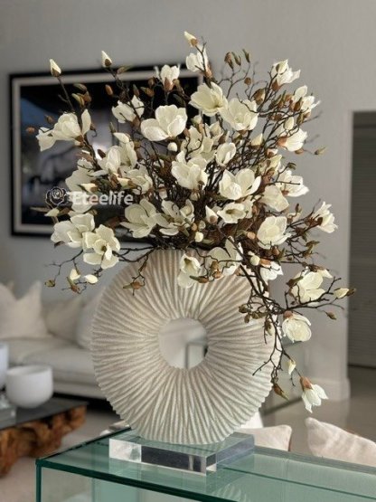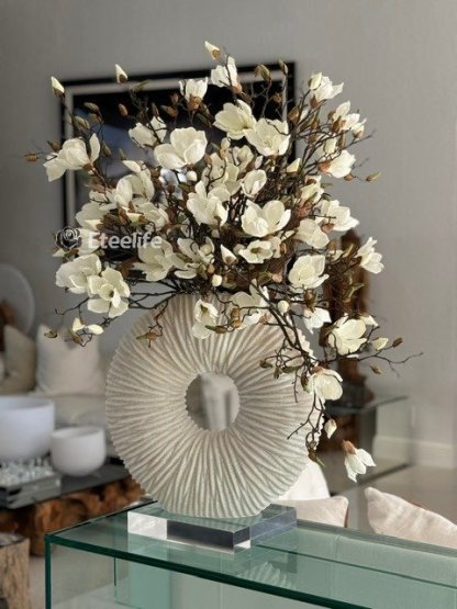 Ever so sleek and elemental round shape, this matte beige eternity vase paired with white magnolia flowers and driftwood is an ideal accent for creating an eye-catching focal point in your space. Its delicate blooms of magnolias is just the thing to bring elegance and style to a room. Crafted by hand to replicate quartz, this matte beige ring-shaped vase is made of ceramic stoneware. Distinctly pleated for an interesting look and paired with natural looking magnolias at different stages of bloom, this minimalistic abstract design adds a modern feel and charm to your living room, dining room, bedroom, bathroom, coffee table, etc.