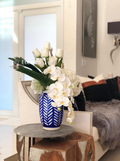 Inca vase in a striped pattern with a mixed bouquet of white orchids, hydrangeas, tulips and star palm leaf