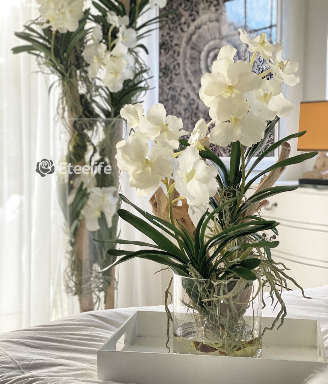 White blooms have made the Vanda orchid a favorite among lovers of exotic flowers. But growing these gorgeous orchids can be tricky; they require bright light and humidity and tend to look best when left in one spot. Our enduring artificial Vanda orchids arrangement looks stunning anywhere—in any light or climate. Generously scaled, lush, and abundant, this arrangement features broad, true-to-life leaves anchored to a piece natural California driftwood. Adding to its beauty is its simple glass cylinder and its life sized rooting system.